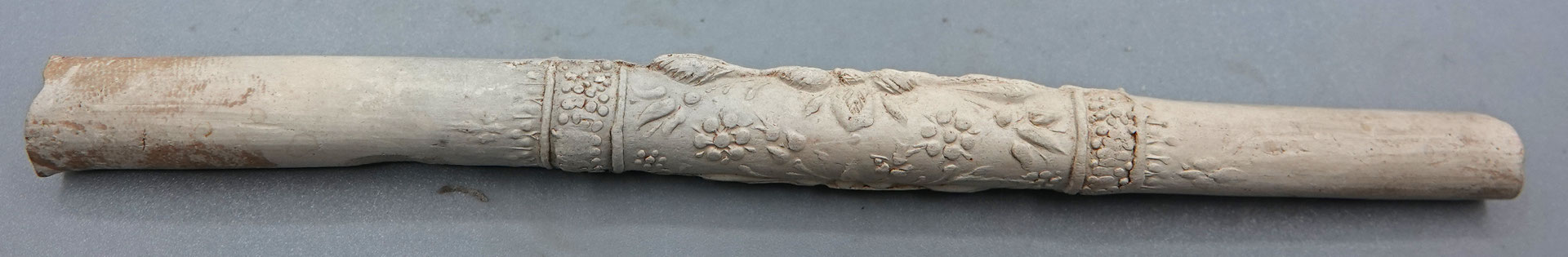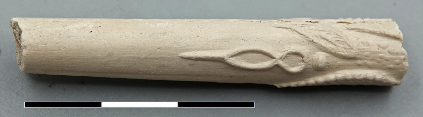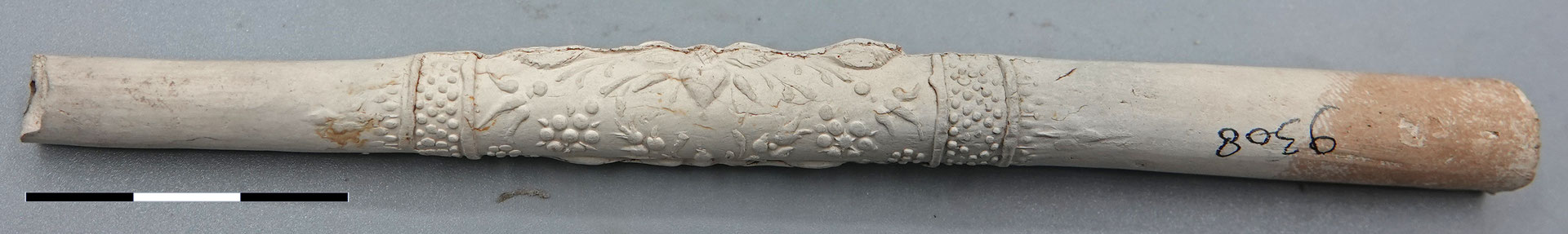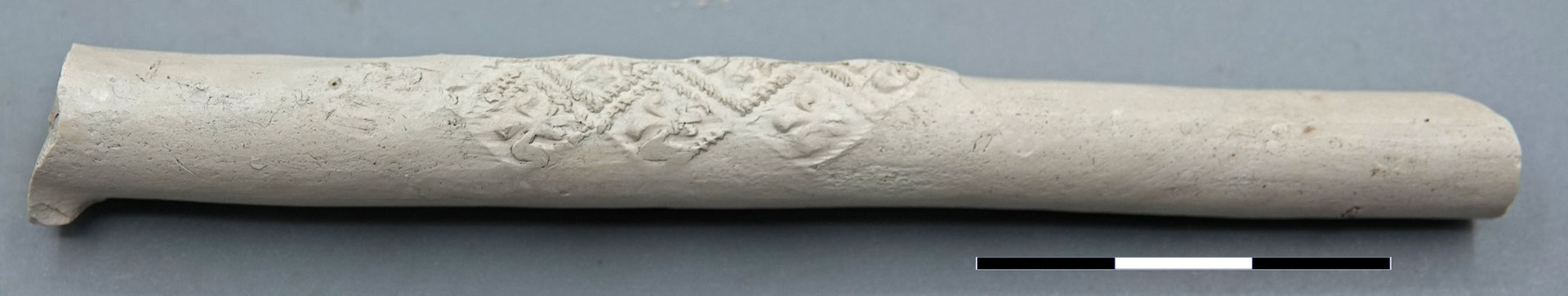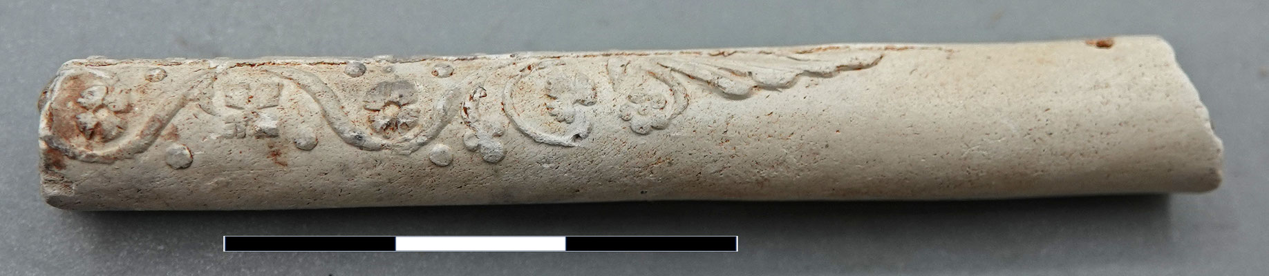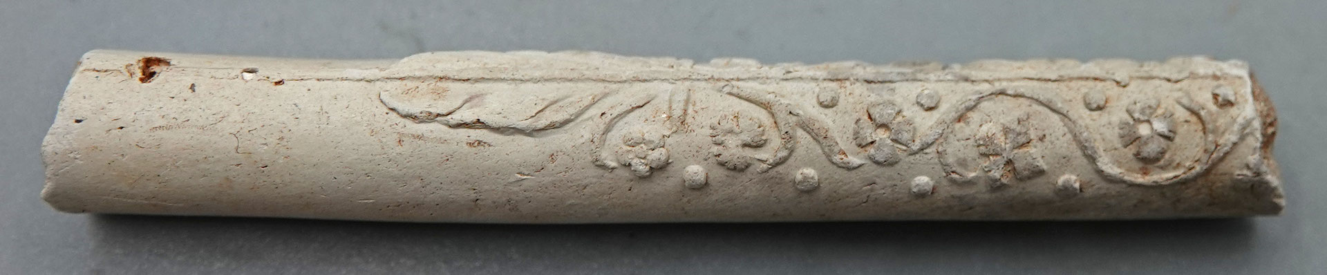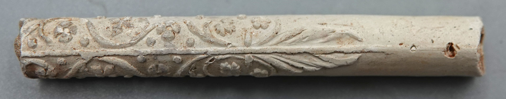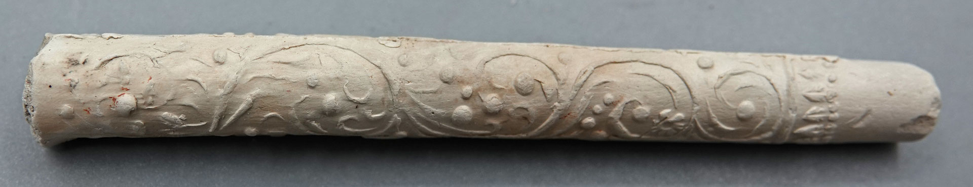 De 17e eeuwse Leidse pijpenmakers versierden sommige van hun producten uitbundig. Het wapen van Leiden (de gekruiste sleutels) waren een populair thema maar ook een schenkkan en roemer. De stelen werden vaak versierd met afbeeldingen van rennende dieren (honden).
