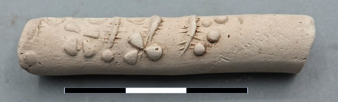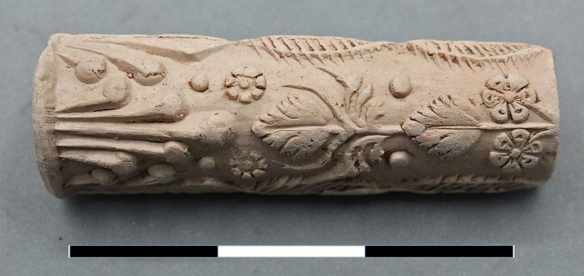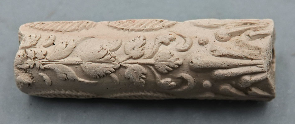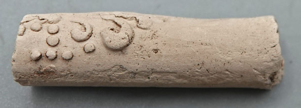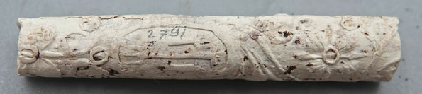 Tussen bladranken, en een bloem met kelk de afbeelding van een drietand met I I en rond het ovaal een ketting van cirkels en stippen. Jan Jansz de Lange, Gouda, circa 1640-1655.
