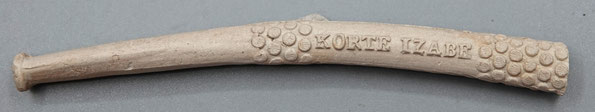 Merk Scheepje op de zijkant van de puntvormige hiel. Op de steel links H.VAN RYST. IZ en rechts KORTE IZABE. Mondstukje ontbreekt.