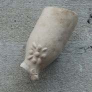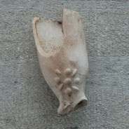 Gestileerde roos met 4 bloemknoppen en bladen, met initialen V en D (in spiegelschrift) aan weerszijden van de hiel
