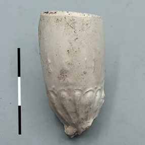 Hierboven een pijpje met op linkerzijde de letters IOH onder een kroon, met daarboven de afbeelding van een haan. Op de andere zijde een man met hoed in de hand (?!). Ca 1740-1780, Gorinchem