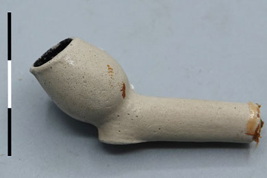 Alleen een hielfragment met een stukje steel. Nr. 10-1167, gevonden in de Haarlemmermeer. Het zou een Engelse pijp kunnen zijn, of in ieder geval een vroege pijp van een origine engelse pijpenmaker.