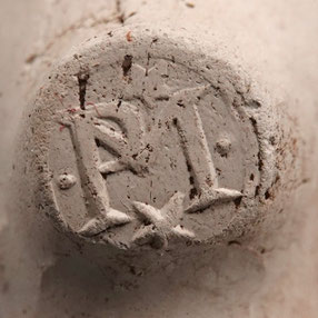 Pijpje uit circa 1630-1640, gevonden in Nieuwkoop. Merk lijkt PM (of MP) monogram met stippen links en rechts en sterren boven en onder het monogram.