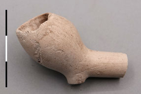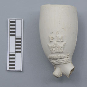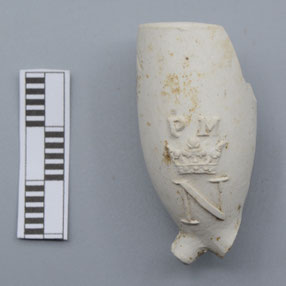 Bovenstaande pijpjes zijn gevonden in stortafval van verschillende Schoonhovense pijpenmakers. De ingedeukte ketel was reden om deze pijp af te keuren en niet voor de verkoop te gebruiken.