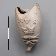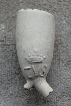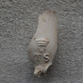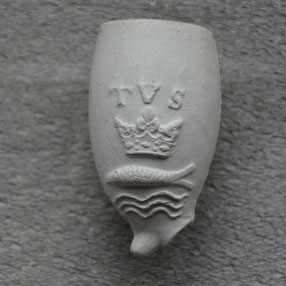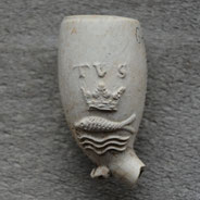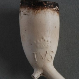 De gekroonde vis of zalm werd na circa 1745 een populaire versiering die door bijna alle vanaf dat moment werkzame Schoonhovense pijpenmakers gebruikt werd. Circa 1745-1800, Teunis van Son junior of zijn zoon.
