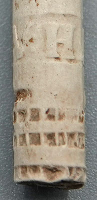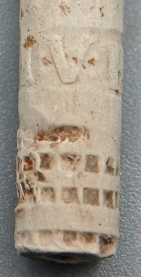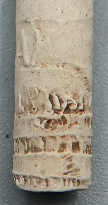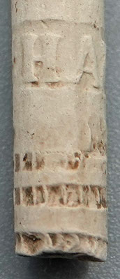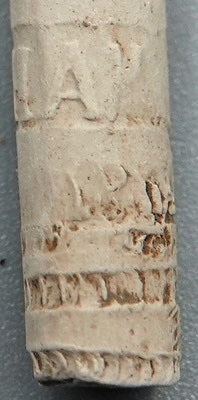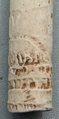 Gevonden in een pijpenstort met stukken pijpenpot, ongerookt. Pijpenstort leek Gouds met merken van Verzijl, zwaan, IB gekroond, HP ongekroond, K maar is gevonden praktisch in Alphen. Zou heel goed Alphen's kunnen zijn. Tevens een duit uit 1788