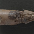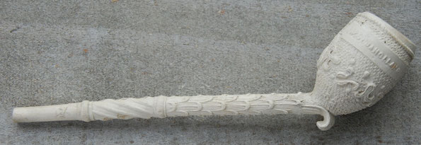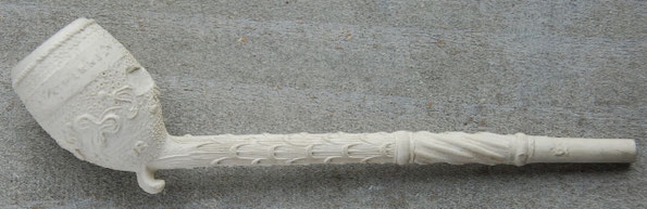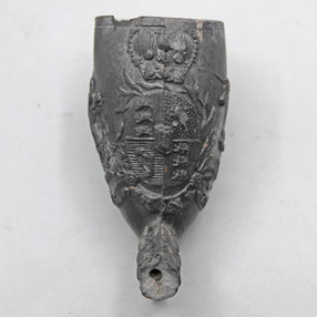 Zogenaamde kromkop. Naar roker toe in reliëf op een golvend lint met "DIEU ET MON DROIT" een wapenschild met vier kwarten met van linksboven naar onder drie lopende leeuwen in eerste en vierde kwart, een staande leeuw in tweede (rechts) en een harp in derde, onduidelijk hartschild, een leeuw en eenhoorn houden het wapenschild vast. Op de steel had deze pijp de teksten "A. & F.S. SPARNAAY" en "IN GOUDA HOLLAND".