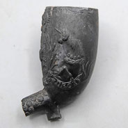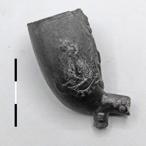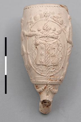Bovenstaande pijp met het merk Molen heeft als bijmerk een Gouds wapenschild met extra stippen op de middenbalk. In Alphen aan den Rijn gevonden.