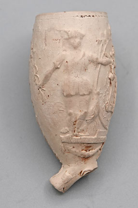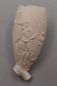 Een pijp met de staande goden Mercurius en Neptunus die het Gouds stadswapen flankeren. Vanaf het begin van de 19e eeuw een zeer populair versieringsthema.