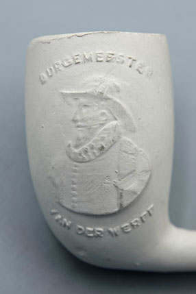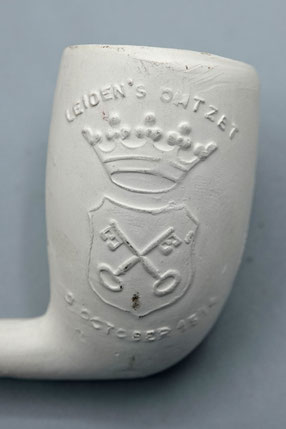 Hieronder een pijp van de firma Goedewaagen. Op de ketel links een portret van burgemeester Van der Werf en opschrift "P.A. V.D. WERF". Op de ketel rechts het stadswapen van Leiden met twee gekruiste sleutels op een schild. Op de ketel naar de roker toegericht de tekst "LEIDEN ONTZET 3 OCTOBER 1574". De steel heeft een merkstempel met tekst "GOEDEWAAGEN GOUDA" en een etiket in blauw en wit met "GOEDEWAAGEN'S PIJP, GOUDA, HOLLAND".