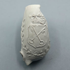 Links op de ketel staan twee mannen, mogelijk burgemeester van der Werf en de Prins van Oranje. Op de andere zijde het wapen van Leiden gekroond. Gouda, 1710-1730